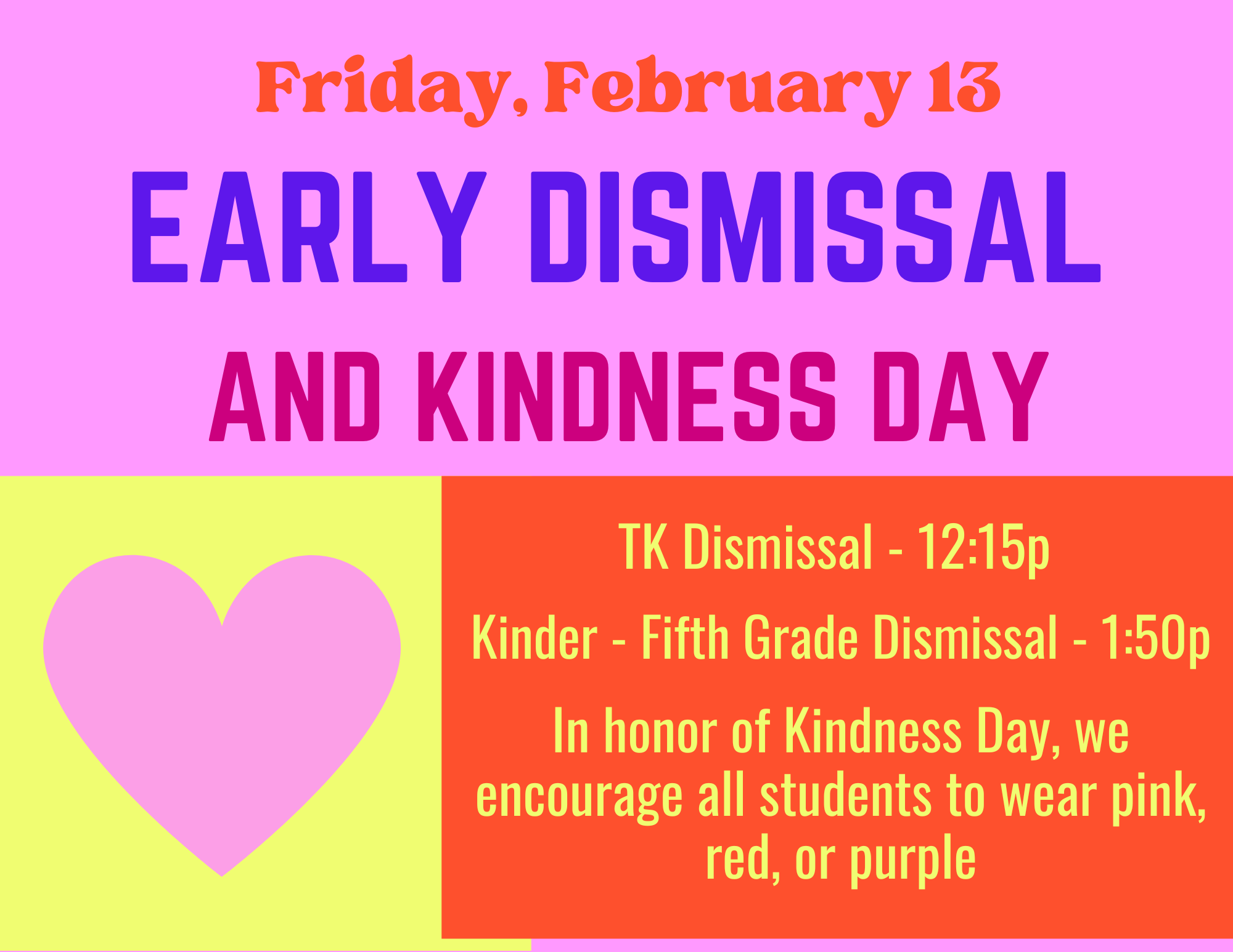 On February 13, we will be having an early dismissal and celebrating Kindness Day. For this spirit day, we encourage everyone to wear pink, purple, and red. TK students will be dismissed at 12:15 and Kinder - Fifth graders will be dismissed at 1:50p.