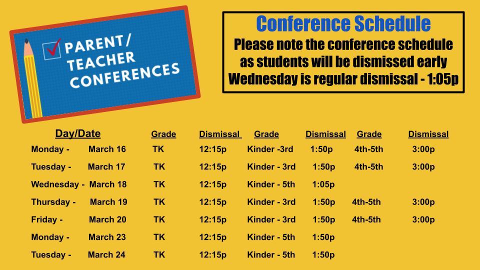 Conference Schedule - Early Dismissal Please click on the title to view the conference schedule for March 16 - March 24. Please note the different times for the different grade levels. Please be on time so that your students teacher can begin their conferences on time.